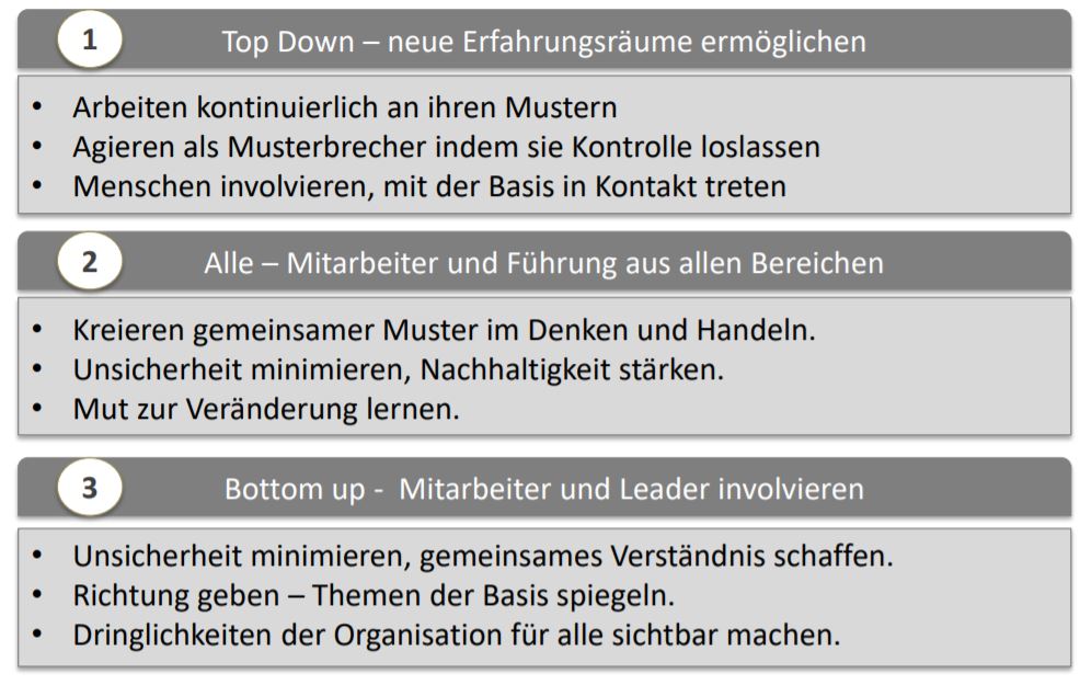 Last but not least, lassen Sie es gar nicht zu schockartigen Transformationen kommen. Streben Sie eine längerfristig ausgerichtete vorausschauende Kulturentwicklung, bei welcher in kleineren Schritten bottom-up die Organisation laufend transformiert wird. Dabei ist die Spannung auszuhalten, welche sich aus den Anforderungen des Tagesgeschäfts und denjenigen für die Transformation ergibt.